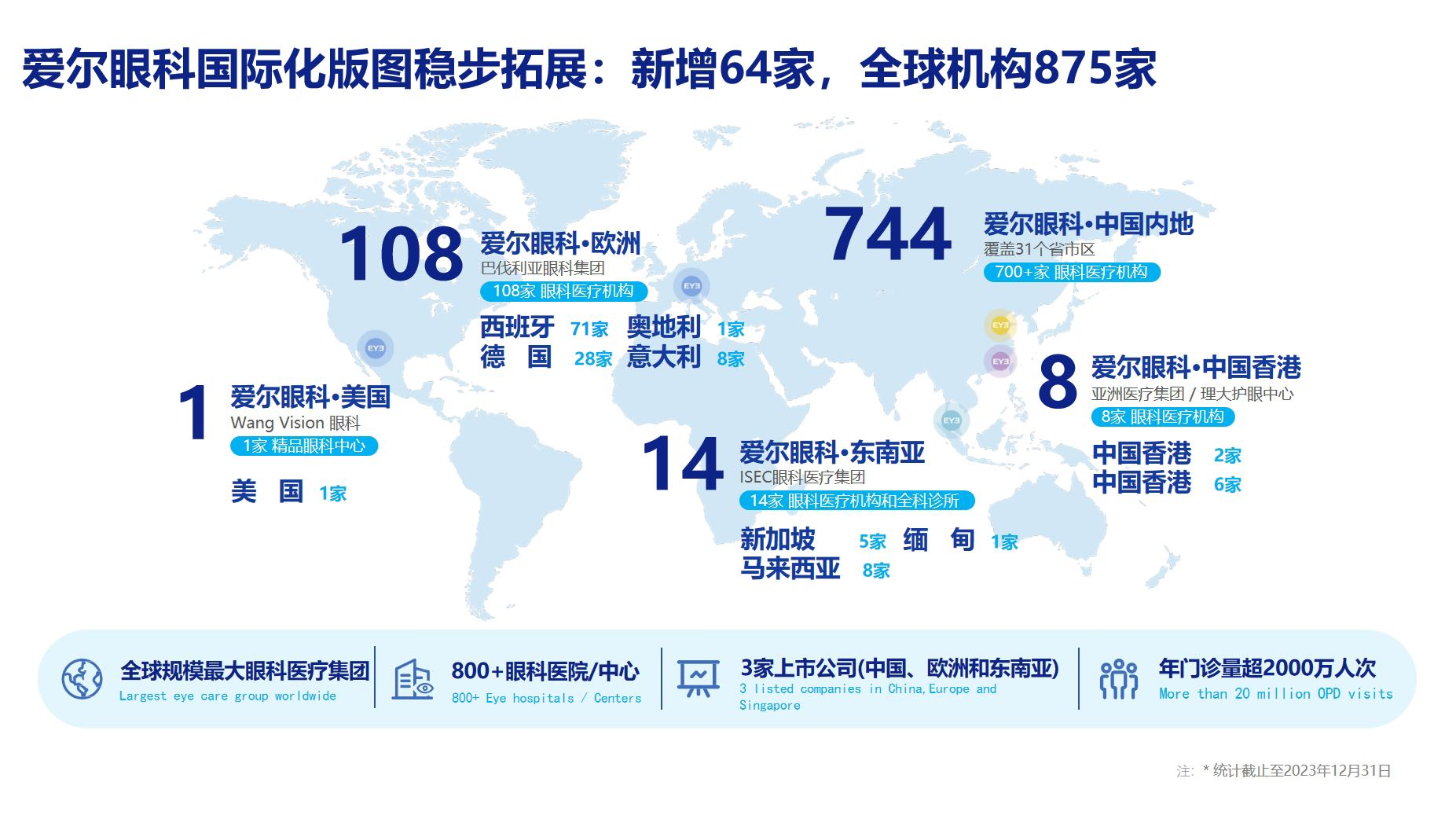 愛爾眼科品牌創(chuàng)立于2002年,醫(yī)療網(wǎng)絡覆蓋亞洲、歐洲和北美洲,于2009年在中國深圳上市(股票代碼:300015),公司在歐洲、東南亞的分支機構分別在西班牙馬德里(CBAV.MC)、新加坡(SGX:40T)上市。截至?2023?年?12?月?31?日,愛爾眼科品牌醫(yī)院、眼科中心及診所在全球范圍內共有?881?家。其中,中國內地?750家(包括上市公司旗下?439?家,產(chǎn)業(yè)并購基金旗下?311?家),中國香港?8?家,在海外布局突破?123?家眼科診所, 包括美國?1?家,歐洲?108?家,東南亞?14?家。